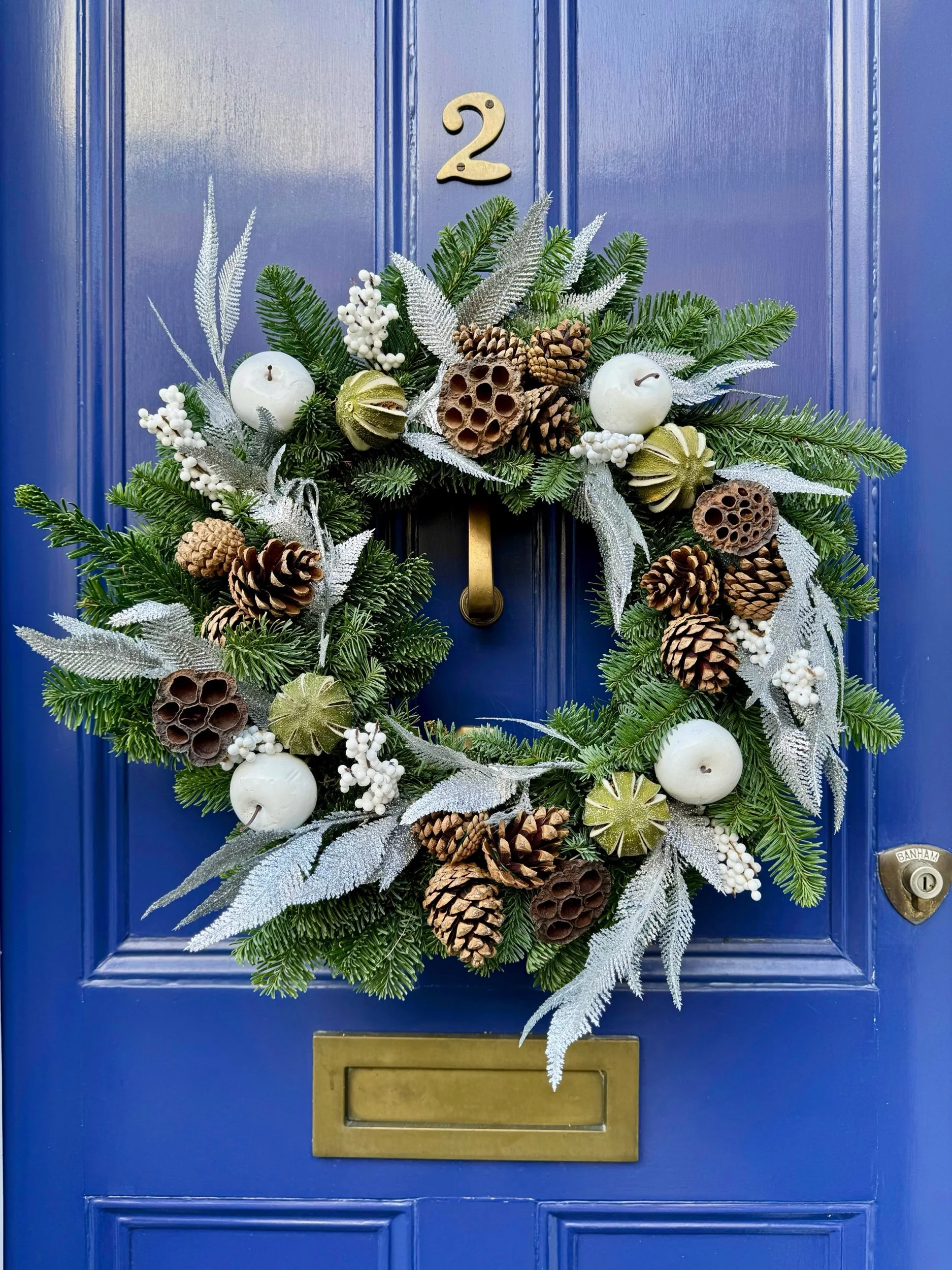Handmade mix of natural cones, dried lotus, green oranges, white apples, white berries and silver leaves.