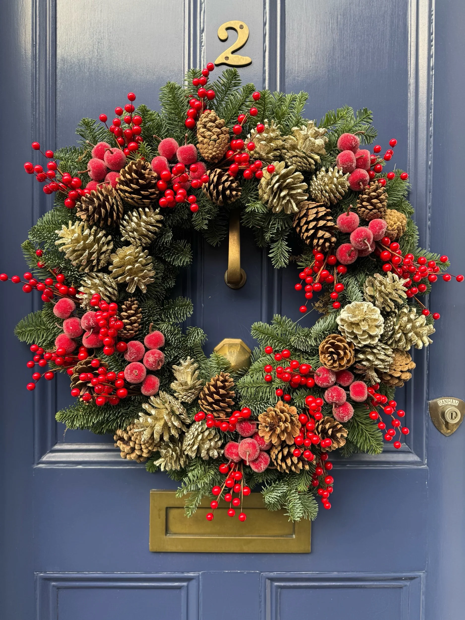 Handmade mix of natural cones, platinum cones, red berries, and mini sugared apples.